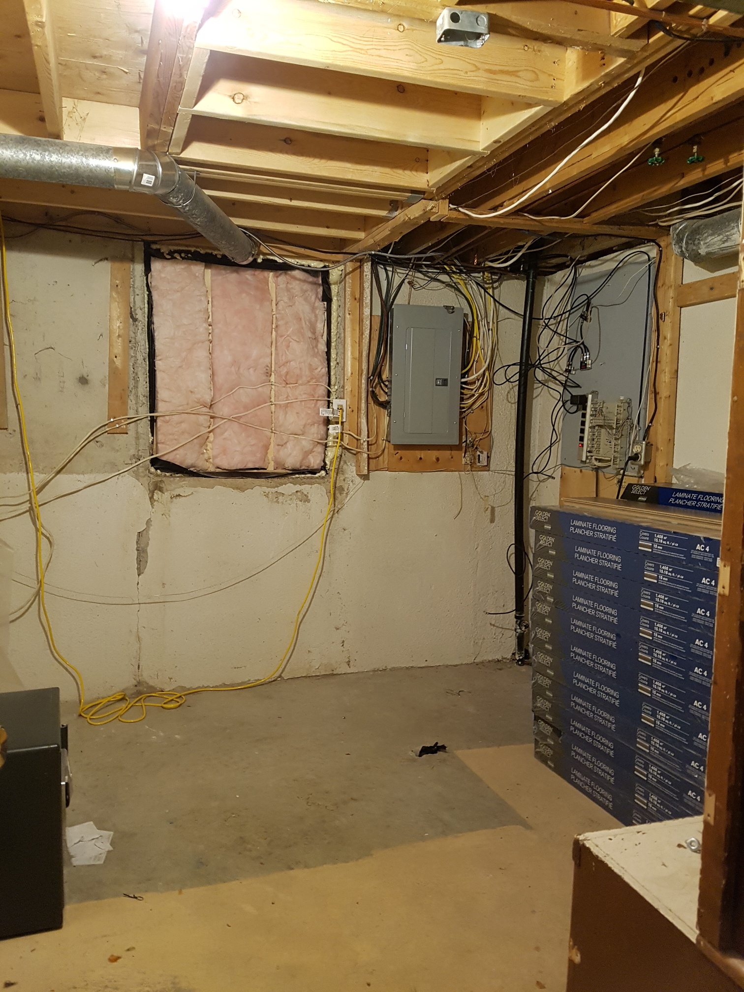 Our laundry room makeover was part of a larger basement renovation, in which we moved the furnace, water heater and laundry to the other side of the basement. Our new laundry room is now in the space that we used to call our ‘utility room’. It was dimly lit, and even less finished than the old laundry room, as you can see in the Before photo below.